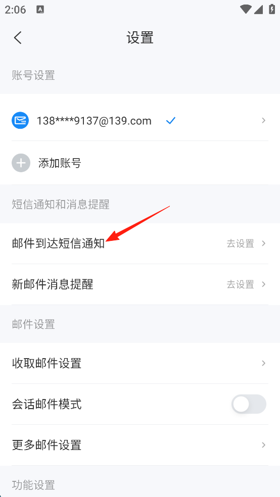 4、点击“邮件到达短信通知”。
