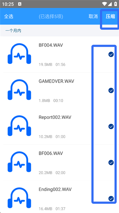 2、以压缩音频文件为例,勾选相关文件,点击【压缩】。