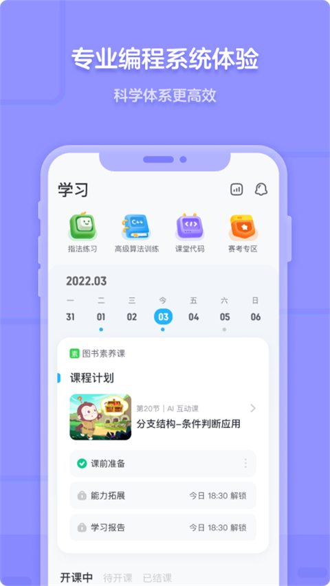 1、课堂内容全面 课程内容的设计理念上将计算思维全面应用到了编程知识学习的各个环节,更关注编程知识在不同领域的应用,在游戏、数据分析、人工智能等专业领域,孩子都将收获满满、看到更多编程的神奇运用。 2、学习模式多元 课程采用真人直播+AI互动的学习模式,同时配备丰富多彩的课后拓展活动。充分考虑了不同孩子之间学习情况和习惯差异。 3、赛考活动丰富 以双测评体系为基础,组建多元化的赛考体系、让孩子们的学习成果“看得见”。中国电子学会组织的Python语言水平测试、中国自动化学会组织的人工智能核心素养测评(AICE)、蓝桥杯等,用户根据自身情况拥有更多选择。 4、系统平台强大 日常学习使用的IDE平台,通过新算法的帮助在代码运行速度上实现了重大提升;班主任通过AI互动课的监课平台,随时发现学习有困难的学生,并及时给予帮助,IM辅导工具实现与学生一对一的交流。 5、师资过硬 明星教研团队,数万节直播课经验沉淀,严选优质师资,专业班主任个性化伴学,让家长能够安心托付。 6、秀出成果 各类编程实验室,可自由发挥创作灵感,还可通过学习报告、作品分享,让孩子之间更方便的交流作品。软件亮点