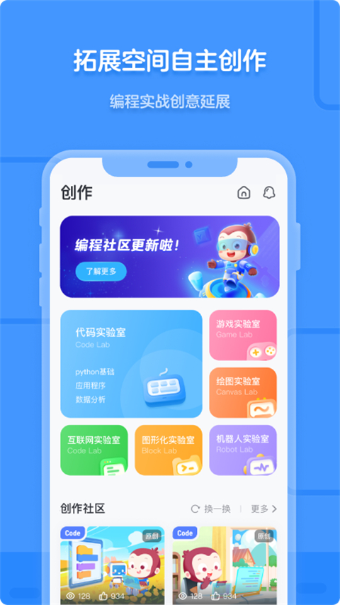 1、下载进入猿编程少儿版软件,在首页中有图形化实验室、代码实验室、绘图实验室、游戏实验室;