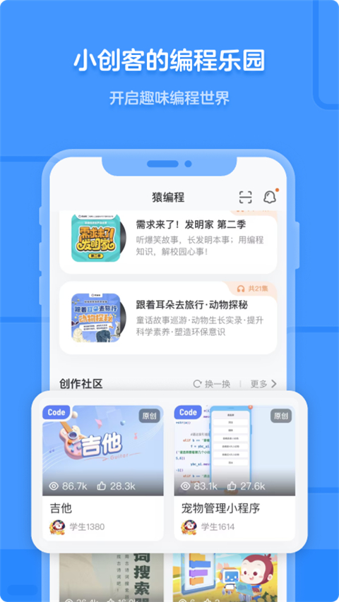 1、严选优质师资 海内外专业院校毕业的优秀老师讲解课程,带给孩子更专业的学习体验; 2、2个AI领域的全球第一 猿辅导在“微软机器阅读理解水平测试”、“斯坦福问答数据集水平测试”两项AI赛事中均获得全球第一; 3、少儿编程研究院 猿编程创始人李翊、计算机科学家吴军、最强大脑脑科学家刘嘉强强联合,从多个细分领域出发,研发更适合孩子学习的编程课程。猿编程少儿版app如何自己创作作品