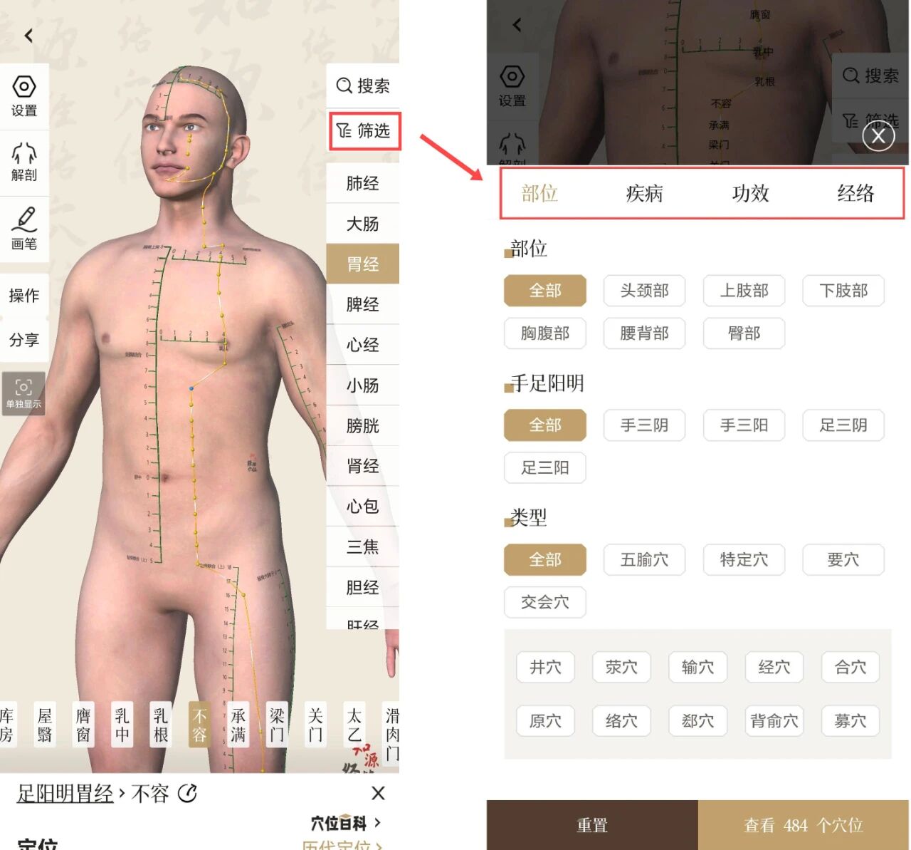 第二步:查看筛选选项,可看到“部位—疾病—功效—经络”等选项,您可以根据自己的需求进行筛选不同类别的穴位