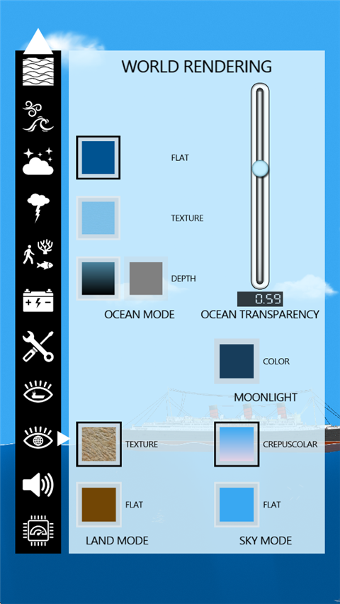 1、拥有泰坦尼克号、战列舰、单帆船、贸易商船等多种船只。 2、从船体材料变形到海水波纹,从火焰燃烧到金属腐蚀,视觉效果细腻真实。 3、可切换昼夜交替场景,调节天气与光照,观察不同环境下的物理表现。更新日志