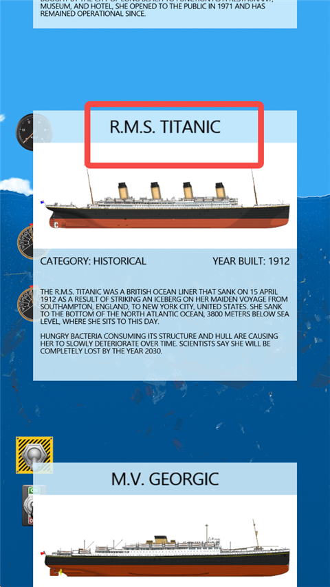1、现在会在退出游戏时保存设置,并在下次游戏时重新加载。 2、提高了预览中船只的分辨率。 3、修复了一些崩溃问题。 4、新增了4艘船只。 5、增强了泰坦尼克号的坚固性。并新增了坚不可摧版本。游戏截图