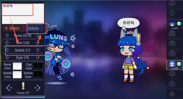5、输入语句内容,点击【Bubble】选择气泡样式,然后点击【Update】即可显示在场景中。