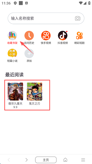 5、返回主页面,在“最近阅读”以及“收藏书架”处都可直接观看漫画。