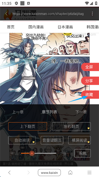 4、这样就可以观看漫画了,点击屏幕,随后就会出现弹窗,可以点击屏幕右侧的“收藏”,可以方便下次直接继续观看。