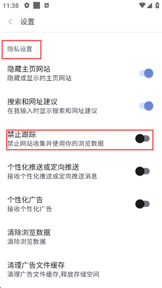 6、在设置界面的“隐私设置”板块,还可以开启“禁止跟踪”功能,用于保护用户的隐私安全。