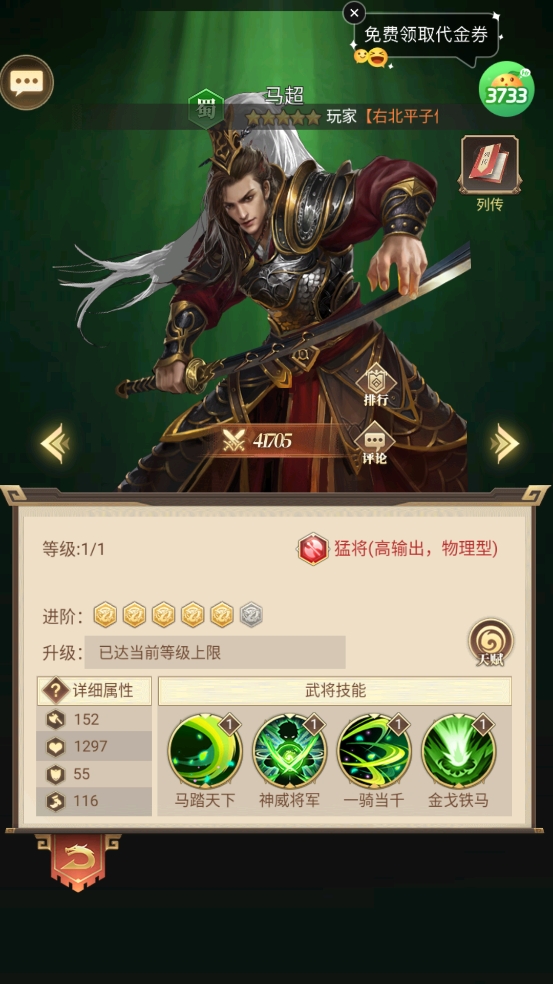 3、一骑当千:对生命比例最低的敌方武将造成261%物理伤害,本次攻击对生命低于30%的武将伤害提升15%,此技能造成击杀时,恢复马超15%最大生命值