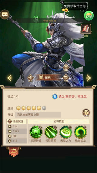 一、赵云 武将列传:字子龙,常山真定(今河北省正定)人,三国时期蜀汉名将,与关羽、张飞并称“燕南三士”。他被刘备称作"一身是胆”,其“常胜将军”的形象被广为流传。 技能介绍: 1、龙胆神威:保护己方攻击最高的2名武将,分担其所受伤害的40%,并提升自身和目标5%免伤和5%抗控,同时为己方全体武将附加【镇卫·伤增】效果,持续2回合 2、常胜将军:生命提升30%,防御提升10% 3、无双之力:驱散自身所有负面状态,同时恢复等同【生命上限*15%】的生命,并为自身附加【震慑】,持续1回合,不可被驱散 4、枪出如龙:【普通攻击】强化为201%攻击伤害的,并额外造成赵云生命上限10%的真实伤害,最大不超过攻击8倍:攻击附带20%吸血效果;战斗开始作为前排武将时,为己方全体武将附加【镇卫·强身】