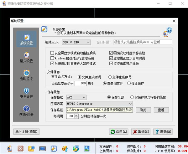 摄像头安防监控是一款专业的摄像头监控系统软件,用户使用普通USB摄像头加上本系统,就可以让您的个人电脑也拥有企业级的智能现场监控录像功能,帮助用户轻松监控办公、家庭、工厂等场所。软件同时支持视频及音频的录像、完善的报警功能、全天候的循环监控、定时监控、定时关机、老板键、定时及连续拍照等等功能,是用户家人生命及财产安全的重要保护神之一。 摄像头安防监控系统使用独创的网络加密技术,以使您的资料能安全的在网络上进行传输,同时系统也拥有相当完善的防黑客措施,同时我们还在不断的加强各种安全手段,请您放心的使用。