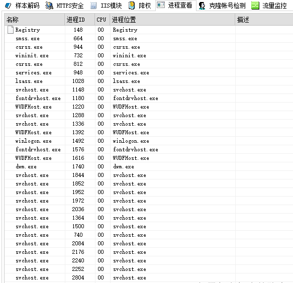 3、进程查看:支持软件名称、进程ID、CPU、进程位置、软件公司信息、进程相关说明等信息查看。