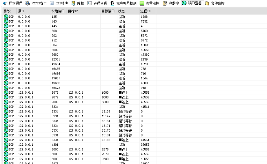 4、端口查看:支持协议名称、源IP、本地端口、目标IP、端口状态、只显示80端口。
