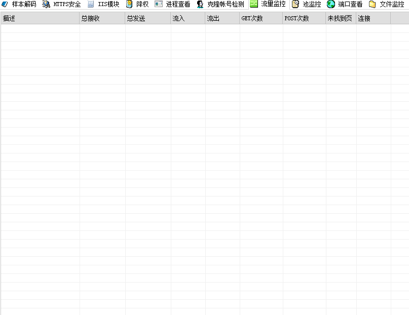 5、流量监控:显示浏览数据描述、总接收、总发送、流入、流出、GET次数、POST次数、未找到页。