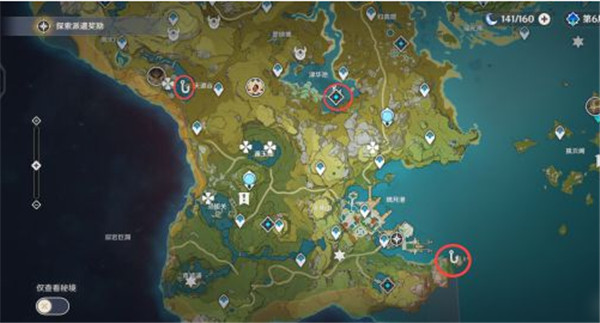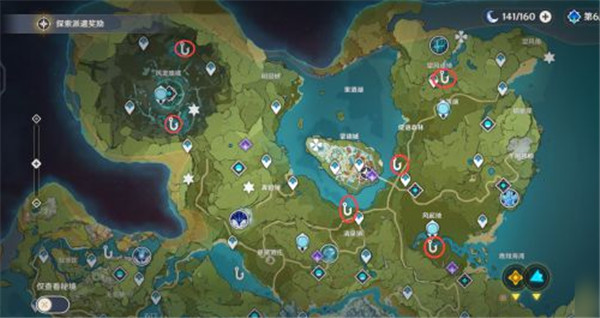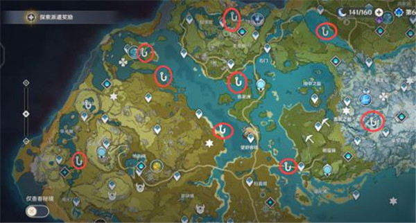 游戏增加了钓鱼的玩法,并且地图中有多个钓鱼点,通过合适的鱼饵可以钓到相应的鱼种。 共27个钓鱼点,每个鱼点分昼夜两个鱼群,一次性可供201条鱼。 蒙德地区钓鱼点: