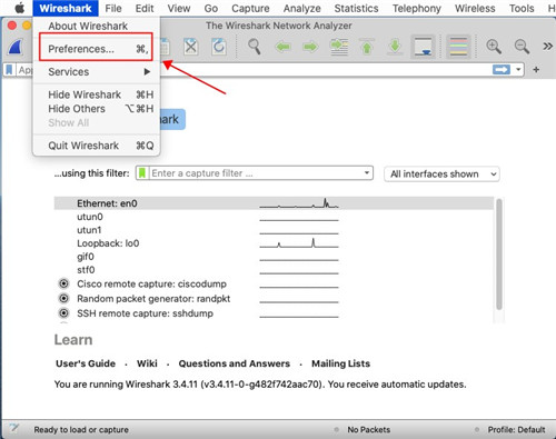 2、选择"Wireshark"->"Preferences..."菜单