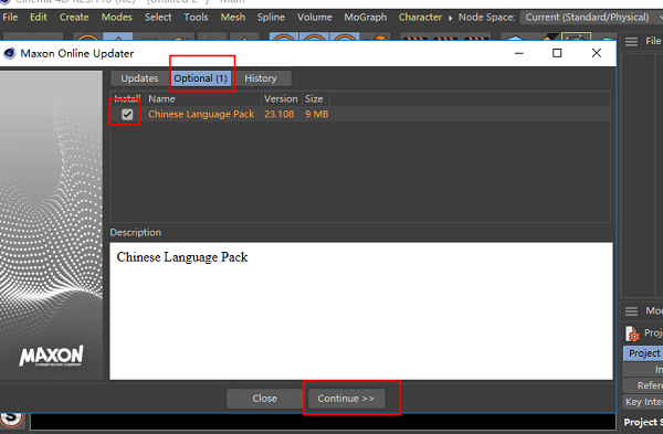 12、点击optional,勾上Chinese,然后点击continue。