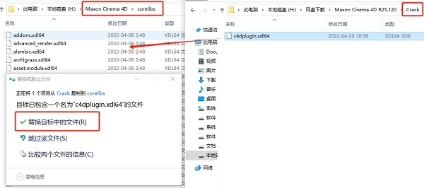 8、将Crack内的c4dplugin.xdl64补丁文件复制到软件安装目录下的corelibs文件夹进行替换。
