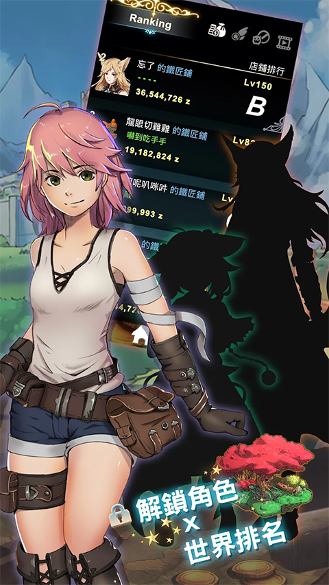 1、赚钱吧 爷爷只留了个烂店铺给你,自立自强吧,赚钱的方式可以透过打怪、买卖武器、开箱子或挂机等等,累计金钱还有机会进入资本额排行。 2、点击与锻造系统 游戏采点击或拖划的玩法,轻松游玩让玩家不需盯着萤幕也能操作,除此之外还需要搜集各种素材与锻造书来锻冶武器,素材可由魔物身上、市集、游戏宝箱等等地方获得,当玩家挑战至更高等层数将会开启更多游戏要素。 3、离线也能继续打怪 游戏里有离线战斗机制,不需开着游戏也可定期上线采收成果,有多张地图与怪物可让玩家选择挂网地点,越强的角色素质与装备将可以带来更多收益。 4、开启更多的角色与召唤魔物 游戏中达成特定条件将可以解锁其他角色,不同角色有不同特殊能力;搜集到特定道具(魔物卡片)后还可以“召唤魔物”成为玩家的战力!去收集你看上眼的魔物吧! 5、游戏评价与排行 根据游戏进行完成度给予玩家评价有锻造达成率、图鉴达成率、到达层数等等,评价由Level E~SS;根据评价或资本额进行“世界排行”,想出名就挤进去吧! 6、无限转生与精炼系统 没有最强只有“更强”,达到特定条件后可以进行武器精炼与转生,达到突破天际的伤害与无人到达的层数!工匠物语锻造等级怎么提升