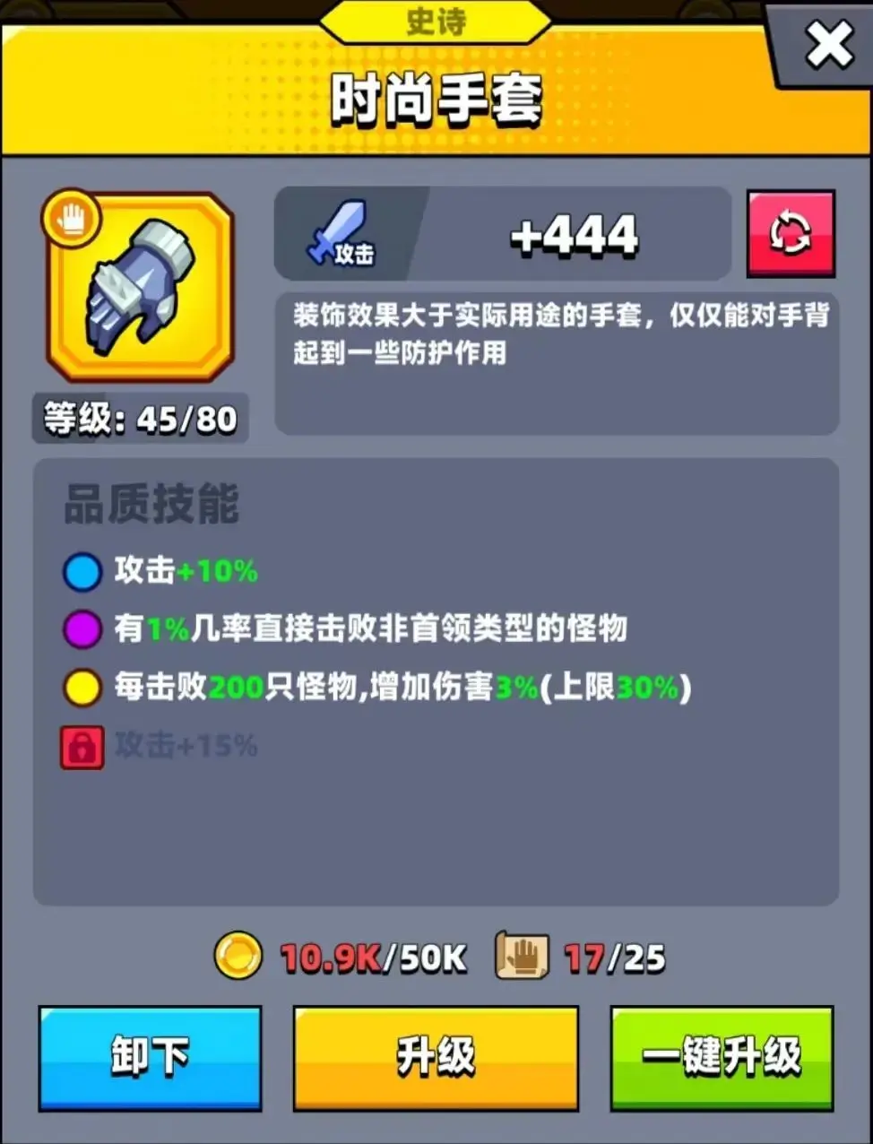 手套:带时尚手套,1%秒杀精英怪这个属性总会给你惊喜,金时尚手套,5分钟左右就能击败2000只怪物,增加我们30%的伤害,这个属性确实猛。