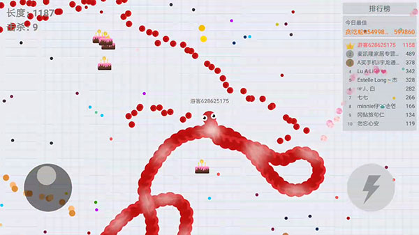 一、加速绕圈 1、如果你对自己的长度有足够的自信(如2000米以上),就可以对一些比较小的蛇蛇直接进行围杀,加速,并朝着自己尾巴方向移动,在里面的蛇蛇发现之前迅速合拢,就完成最基本的包围了。 2、但是围成圈圈并不代表胜利哦,首次绕的圈圈势必空间比较大,若里面的蛇蛇仍不死心,会继续陪你原地转下去。接下来需要慢慢得缩小你的圆圈,转得太慢可能绕圈的半径就会变大了,并且注意你的头部不要触碰到里面的蛇蛇。接下来就看谁先失误啦。 二、原地绕圈 1、若非常不幸,你的蛇蛇被人围住了,不要灰心,继续绕下去。并且尽量往大蛇蛇的头部方向移动,并且绕最大圈。 2、对于大蛇蛇来说,它的性命更加值钱。也可以联合你的小伙伴一起限制大蛇蛇的绕圈路线,逼迫它失误。若是可以反杀,那可以大大壮大你的长度哦。 3、当你围住别人,小心你也会被别人围住,因为此时你也是缩成一团的状态,容易被其他的大蛇围住,所以在围杀他人时也要小心自己,有危险就放弃。 三、击杀攻略 首先我们要了解游戏的击杀规则:当你的蛇头撞到另外一个蛇的身上或是游戏版面的边缘是,你就死了。 1、把敌人围到游戏版面的边缘处,等他出错。 2、利用加速效果,快速横挡在敌人的前进路上,如果他反应不及就可能会直接撞上你的身体完成击杀。不过这种方法也有很大风险,需要有很好的预判和操作才行,否则挂掉的可能就是你。 3、如果你的身体够长,也可以把其他小蛇围到你的身体内部,然后慢慢缩小包围圈等他出错。但是这种方法也是有风险的,因为在你缩小的同时也有可能被其他大蛇围住,所谓螳螂捕蝉黄雀在后,所以一定要小心谨慎,情况不对就赶紧放弃围捕吧。更新日志