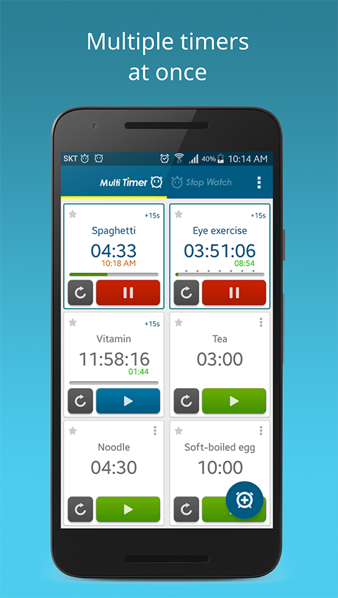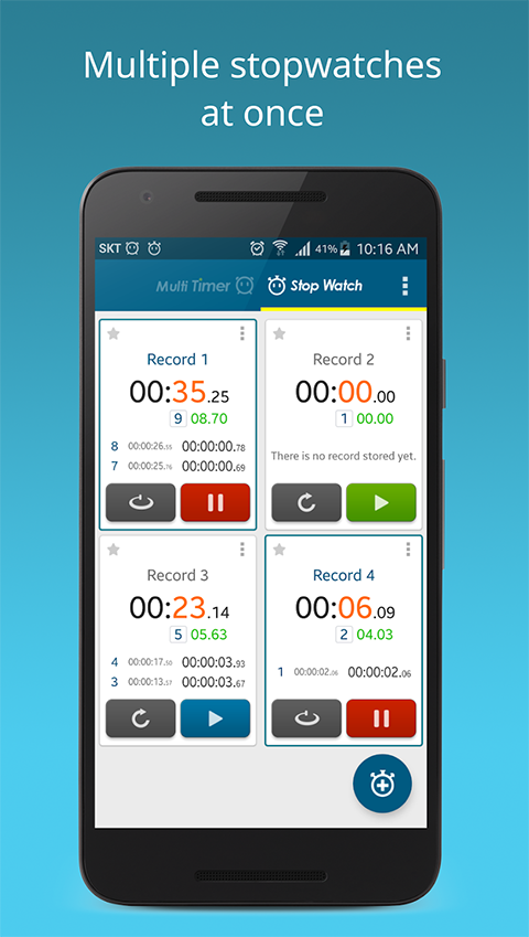 1、一次管理很多计时器:你能将以前设定过的计时器保留下来,下回再用的时候不需要重复设定,只要一碰即成。 2、表中表:计时过程中可以设置小的提醒间隔。例如,在计时快到时先提个醒。 3、漂亮的桌面挂件:简洁美观,还能修改颜色和大小。 4、利用手机传感器:不需要触碰手机,只要在手机上面拂过,就能停止铃声。 5、保存并分享秒表记录:你可以一直保存秒表计时记录,并通过社交媒体如与朋友分享。软件功能