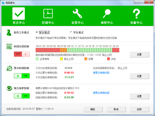 软件提供了家长模式和学生模式,方便家长和学生之间来回切换。当家长输入软件管理密码登陆后,软件自动切换为家长模式工作状态。