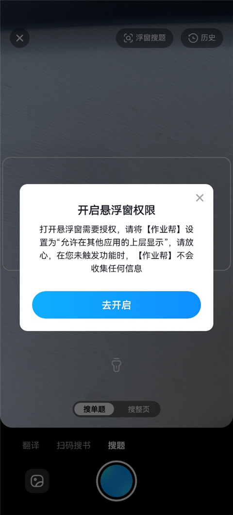 2、点击浮窗搜题功能,弹窗开启相应权限跳转开启即可;