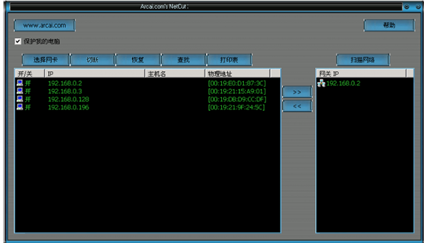 2、利用ARP协议,网络剪刀手(NetCut 2.14)可以切断局域网里任何主机和网关之间的连接,使其断开与Internet的连接,同时也可以看到局域网内所有主机的IP地址和MAC地址