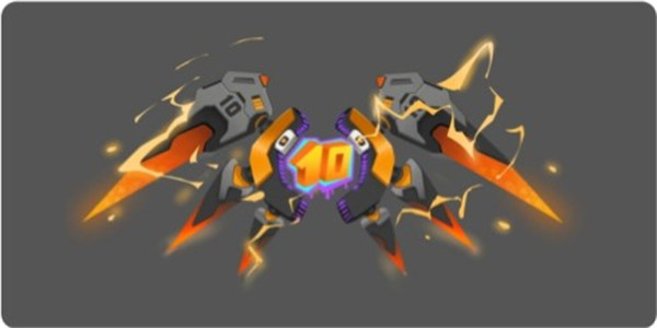 十周年限定背饰-燃跑之翼,与十周年主题呼应,黑灰金配色,翅膀形状,机械电能,电流能量波在机身闪烁环绕,若影若现。
