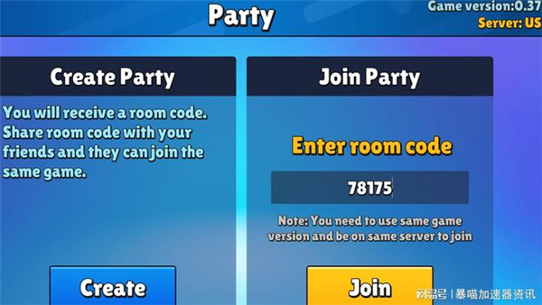 4、点击右侧PARTY进入多人模式,可以创建房间,也可以输入好友的房间代码加入房间;