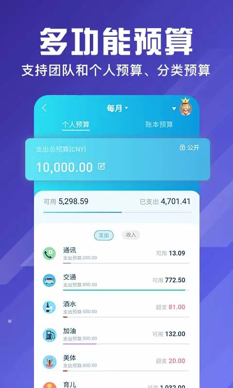 1、智能语音记账 只需说一句话,实现智能分类;自动识别金额、币种、时间、分类、描述,解放您的双手。 2、设备加密 可通过人脸识别、指纹识别、密码等方式进入账本,保护个人隐私。 3、定时周期记账 针对周期发生的固定收支只需设置一次,每次到时间,系统会自动为你记录一笔帐,适合固定收入或扣款如房租(房贷)、保险、基金定投等。 4、拍照&图片记账 票据识别技术,助力一键拍照或图片记账。 5、多功能统计报表 实时显示团队报表和个人报表,也能查看其他成员报表。 6、多成员预算中心 支持多用户多账本的预算,可按日、月、年以及不同类别设定预算。 7、多种分账选择、实时结算方案 支持均分、份额、百分比等分账方式,可实时查看成员结算方案。 8、账单导入或导出 支持主流支付平台的账单导入,也能导出不同格式如HTML或EXCEL。 9、记账通知 每个账本可设置还款提醒、超支提醒、记账提醒、成员变动通知等。百事AA记账app使用教程
