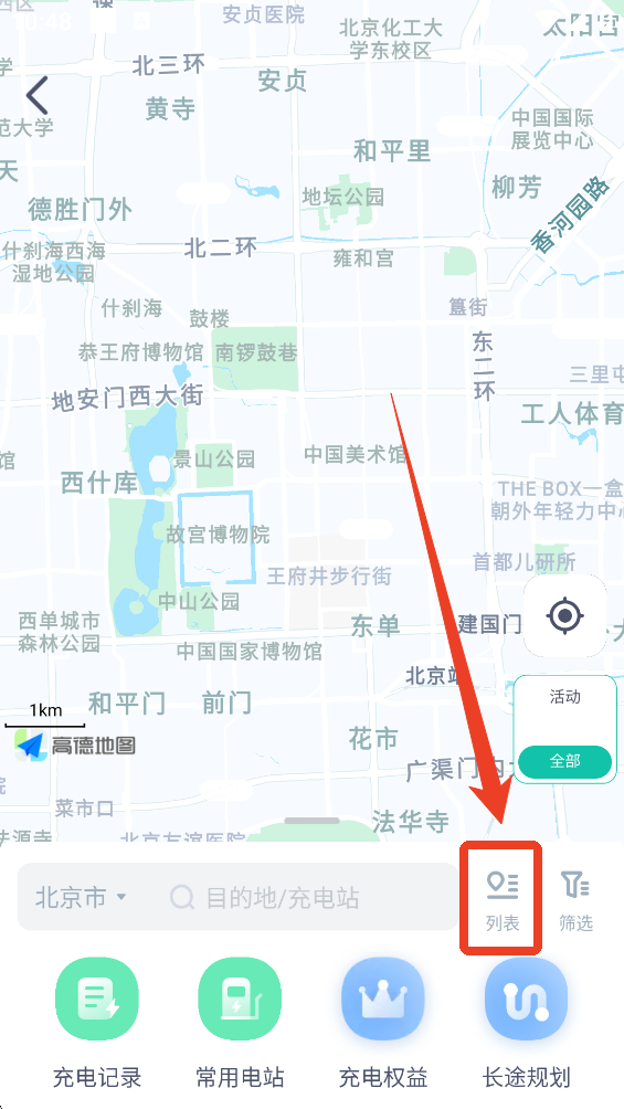 2、点击搜索栏旁边的【列表】,也可以查看附近的充电桩位置。