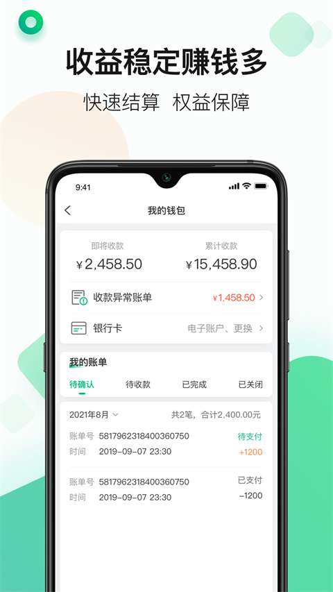 1、付款即时 快速结算,极速到账。 2、货源保障 优质货源,全国发货。 3、金融赋能 电子发票,运费保理。 4、仓单质押 T+1支付,车后服务。 5、保险,电子油卡 维修保养,智能终端设备。功能介绍