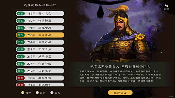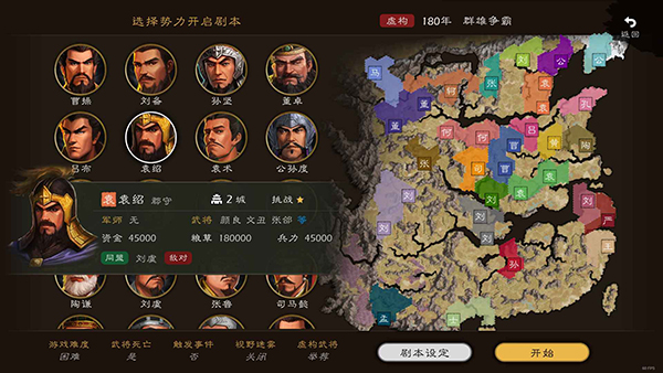 1、首先是开局,点击剧本设定,在这里设定游戏难度以及武将寿命和死亡方式。 难度:新手建议普通开局。 病亡:英雄寿命同历史寿命 斩杀:游戏内部队被消灭后可能会战死(与武力值有关),很多小将,例如高览,淳于琼,孙奋,傅士仁这种很容易战死。 处决:被俘虏后可能会被处决(与性格有关)。 监故:被俘虏后处于受伤状态可能会死亡。 个人建议:新手开局可以把这些全关掉,或者只开一两个,其中病亡和斩杀不建议开,病亡就不说了,可以让很多早夭的武将可以多活(郭嘉),斩杀要关掉是因为很多小将可以用来当郡蔚和运输资源,(我自己玩的赤壁刘备如果不开虚拟武将,灭掉刘表后都还缺将。) 触发事件:个人建议开启,但是要小心历史事件触发后自己丢城(例如198年,陶谦会把下邳送给刘备,如果这时候你在陶谦时期把下邳占领了也会变成刘备的,官渡之战剧本尤其要注意)。 迷雾:关掉。 举荐:每年可以举荐一次,可以四选一一个强度在t2的武将,武将头像右上角有个启字的意思是选择该武将后该武将可以额外多一个技能。 虚构子嗣:可以生孩子(注意生孩子必须父母双方都在同一个城里才可以生,且母亲怀孕后无法进行任何操作)。 自定义:可以自建势力或者可以指定自建武将到某势力。(需要购买自建DLC) 然后就是开局进入游戏后,各项功能的用处。
