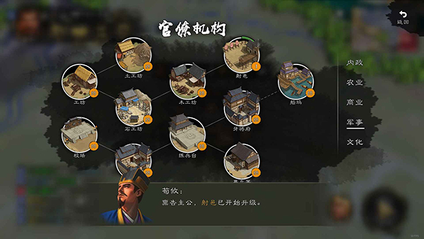 3、第一项官僚,也就是科技,分为上图中的五项,个人建议开局2精舍1太学开局。然后就是优先那些科技,其实主要是结合你自己情况来看,我个人习惯是,2精舍1太学,然后点军事科技,把募兵科技点满,随后点内政把仓库都点1级在点兵力上限。商业和农业没啥用,只有商业科技中的漕运和加快调遣的有用(漕运:运输部队可以走水路,也就是说如果没有点漕运的话运输队是过不了河的)。