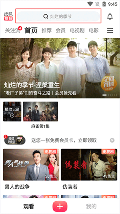 1、首先打开搜狐视频app,进入到首页,点击最上方的搜索框,找到你想看的视频;