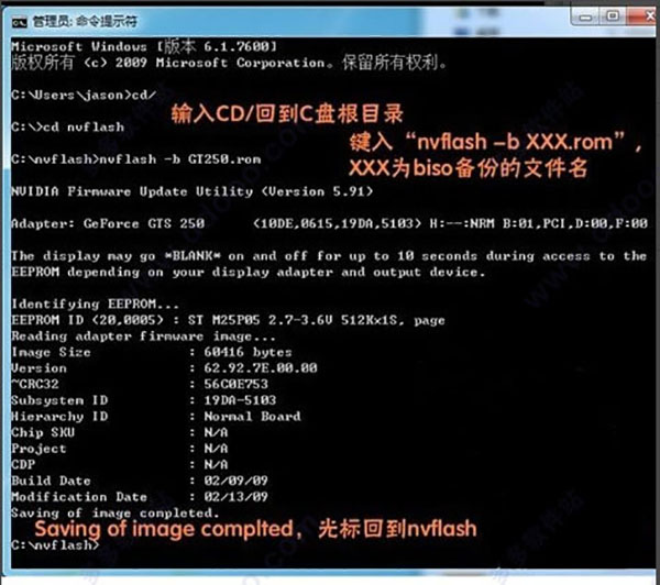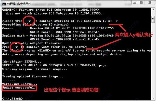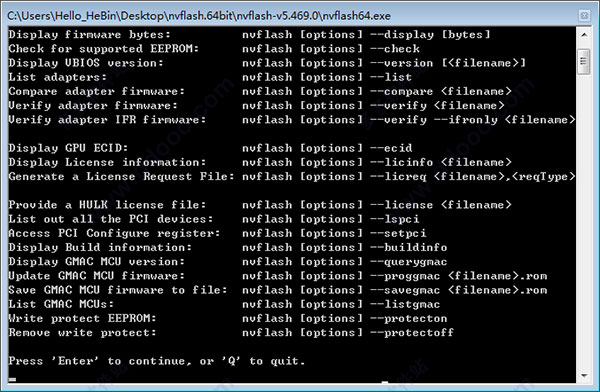 1、升级BIOS:nvflash --filename; 2、保存BIOS文件:nvflash --save filename; 3、对比显卡BIOS版本:nvflash --compare filename; 4、升级TV数据:nvflash --tv filename; 5、显示BIOS版本:nvflash --version filename; 6、显示BIOS字节数:nvflash --display; 7、开启写保护EEPROM:nvflash --protecton; 8、关闭写保护功能:nvflash --protectoff; 9、设置IEEE 1394标识:nvflash --guid; 10、显卡适配器列表:nvflash --list; 注意:NVFlash的Windows版本并不是完全的直接运行图形界面,需要在命令提示符下操作,操作方法与DOS下的命令完全相同。