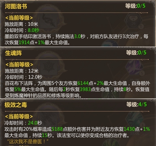 所有职业的治疗技能都在副法宝上,不同职业之间稍微有些区别。