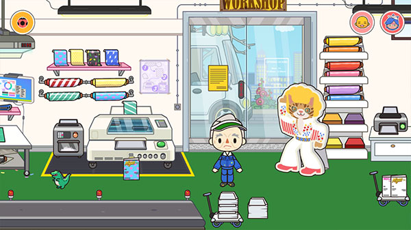 3、点击进入印刷厂,门口有一个大型的猫咪立牌,还有一个管理叔叔在运作打印机器。