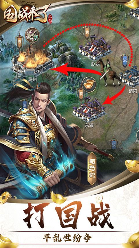1、【灭国轮回,死战不休】 在《国战来了》的战争地图上,你不再是一对一的攻打其他玩家,而是集整个国家之力,举国进攻,更大规模的国战随时爆发!然而,这天下只能有一个统治者,魏蜀吴汉,必然三死一胜,这将是一场关乎生死的国战对抗,没有退路。 2、【军国大策略,运筹千里之外】 四个国家之间的对抗,全服玩家极尽谋略,互相博弈共同谋划这场生死棋局!在敌对的三个国家中,选择哪个国家作为攻打对象?是否要联合其他国家?进攻路线如何敲定?这将是一场覆盖全国的军国大策略,从国家的角度统揽全局,运筹千里之外。 3、【三国名将领衔 千军万马强军出世】 模拟三国正式战场,由三国名将领军,真实还原步兵,弓兵,骑兵多兵种对抗!不同名将能力各异,擅长带兵种类不同,根据不同的攻击范围.攻击力.防御力等,建造属于你的不世强军,千军万马任你调遣。 4、【王者之争,谁将一统三国?】 天下分久必合,这场三国乱世将在《国战来了》中得到终结!魏蜀吴汉四国对抗,终究只有一个国胜出,只有一个王者诞生!谁将是乱世之中的贪狼破军?铁血手腕,极致谋略,带领全国玩家杀伐征战创开国功勋。国战来了01.折游戏攻略