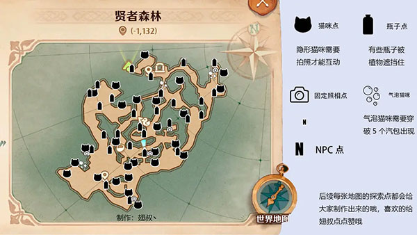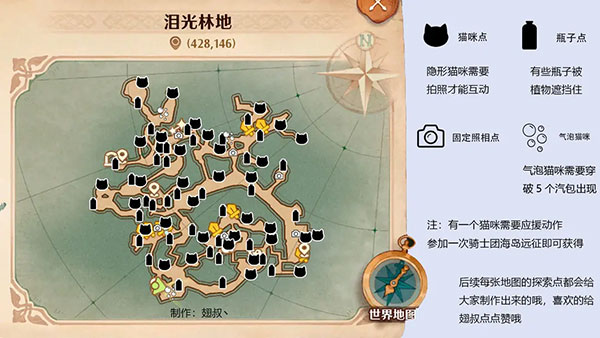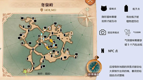相信很多新玩家对于地图探索找猫猫会很懵逼,翅叔给大家把标识都做出来,如果时间多的玩家 还是建议大家自己探索,因为还是很不错的一个乐趣所在,如果是上班族可以看地图标识更短的时间完成探索。