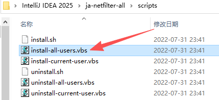 注意:文件路径不得含有中文,否则会报错! 1、右键以管理员身份运行脚本自动配置VM自定义选项: ja-netfilter-all\scripts\install-all-users.vbs。