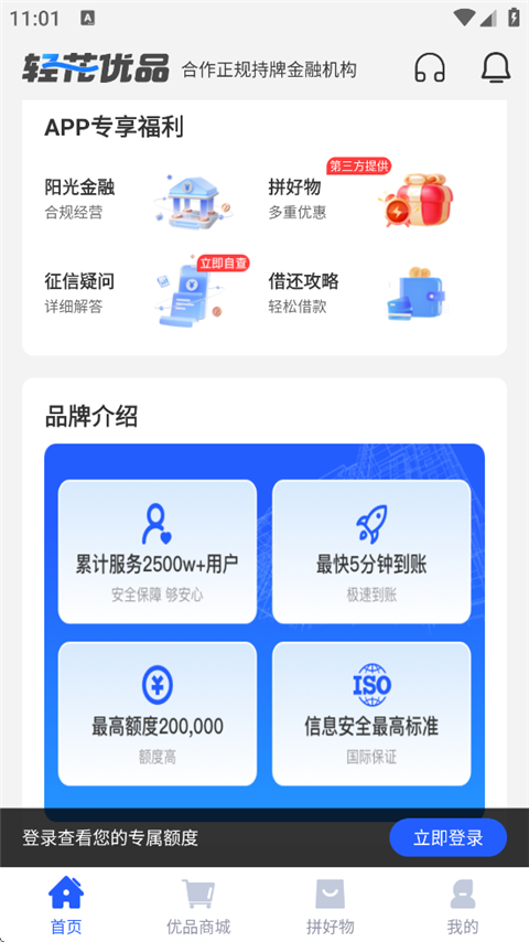 1、累计服务2500w+用户,安全保障够安心。 2、最快5分钟到账。 3、最高额度200,000,额度高。 4、信息安全最高标准,国际保证。轻花优品借款App如何申请信用额度