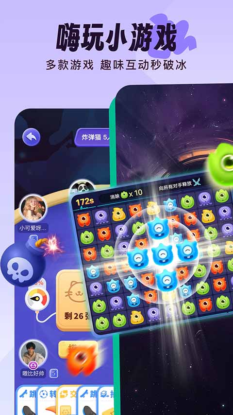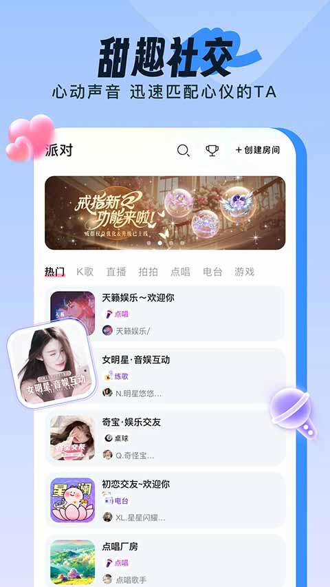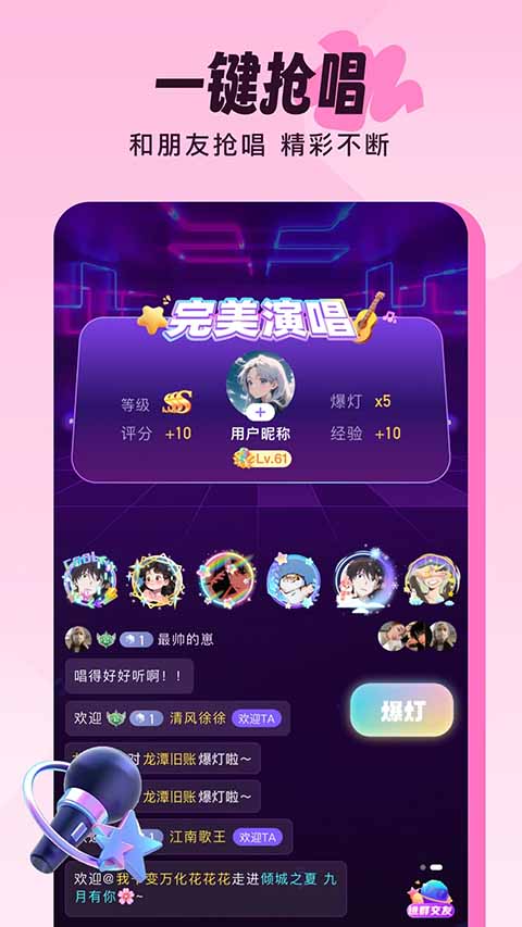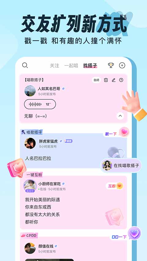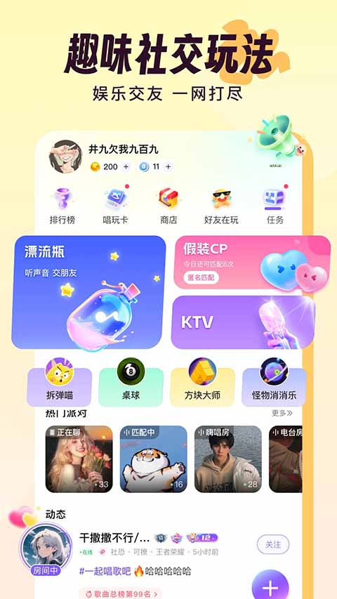 【海量曲库,畅享高级音效】 多款K歌片段模版,支持多种混响,流行歌曲想唱就唱,随时做麦霸。用实力收获更多听众,唱的好听还会收到礼物打赏哦! 【一起唱,找到志同道合的音乐伙伴】 独特的在线匹配算法,根据你的声音特质为你匹配与你契合度高的优质声音,让你只凭声音就能找到跟你音乐品位相投的同龄人,快速匹配到令你心动的好声音。 【交友广场,找到一起玩的TA】 唠嗑、开黑、唱歌,一起分享生活点滴,一起热闹互动,彻底消灭孤单。软件特色