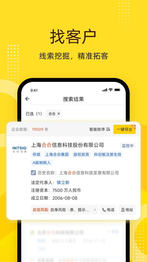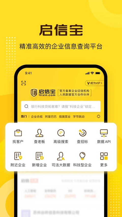 【多维度的信息查询】 可查看企业多维度的全方位信息,包括企业简介、工商信息、对外投资、法院判决、失信信息、经营异常、招聘信息、专利信息、域名、著作权; 【精准搜索企业客户】 启信宝数据库含境内3.1亿家企业等组织机构,多维度企业信息快速查询,支持自定义搜索、模糊搜索,精确找到企业级客户; 【企业风险信息监控】 实时更新企业动态,包括工商信息变更、管理层变更、企业舆情、司法判决、异常经营等,实时核查企业状态,有效控制风险; 【新增企业实时推送】 收录境内3.1亿家存量企业等组织机构全维度信息,提供省份或城市的新增企业统计,并且支持导出新增企业的工商信息,为企业业务开展提供最新鲜及时的消息推送;功能介绍