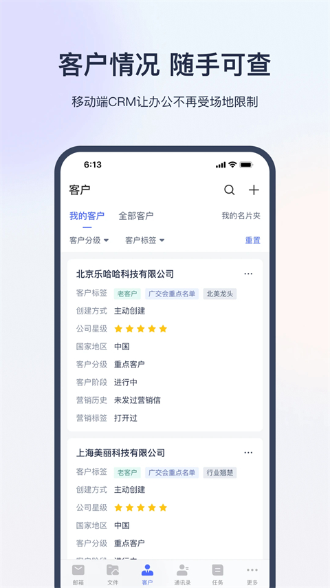【智能邮件,体系安全】 邮件智能分类,有效节省邮件处理时间,让精力聚焦于重要事情之上。通过安全测评认证,采用大型矩阵式服务器架构,分布式部署海外服务器,保证邮件收发全球畅通。 通讯同步,实时高效 主题归类,智能呈现 已读未读,一目了然 快捷回复,高效便捷 【移动CRM,简单好用】 随身CRM,客户信息随时随地可查,不错过任何商机机会。 客户列表,清晰高效 团队客户,快速查询 客户邮箱,一键写信 往来邮件,随时可查 【数据看板,高效整合】 移动端工作台,随身团队助理。多维度查看团队和下属数据,轻松管理业绩进展 团队数据,高效透视 下属pk,轻松管理 业绩进展,随时追踪 【客户邮件,一目了然】 自动聚合客户邮件,不再遗漏重要邮件。查询下属和客户往来邮件,随时掌握业务情况 客户邮件,自动聚合 下属邮件,轻松穿透更新日志