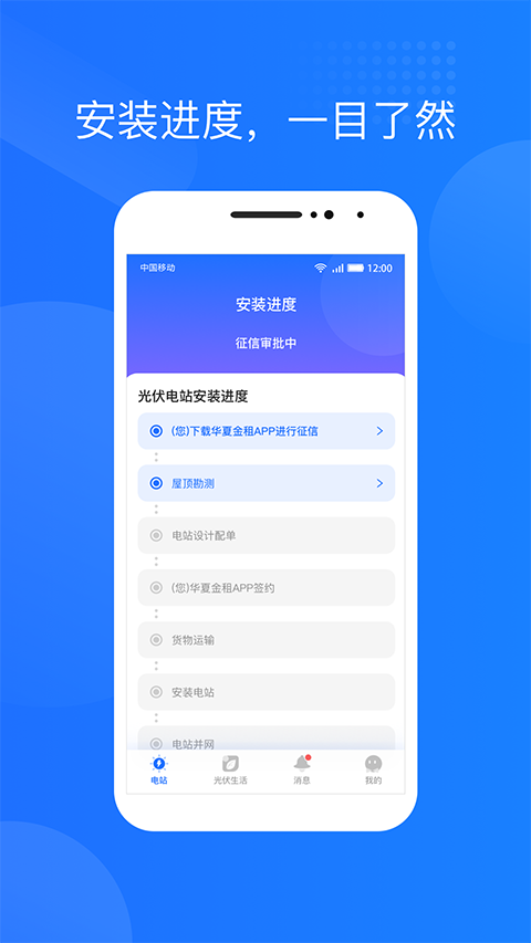 1、在线申请安装光伏电站,快速完成代理商关联和电站申请。 2、安装流程进度实时可⻅,提供⼀站式电站安装服务。 3、发电数据和发电收益直观展示,可查看每天每⽉及以往的发电情况。 4、光伏⽣活模块可查看电站知识普及和发电收益分析。应用亮点