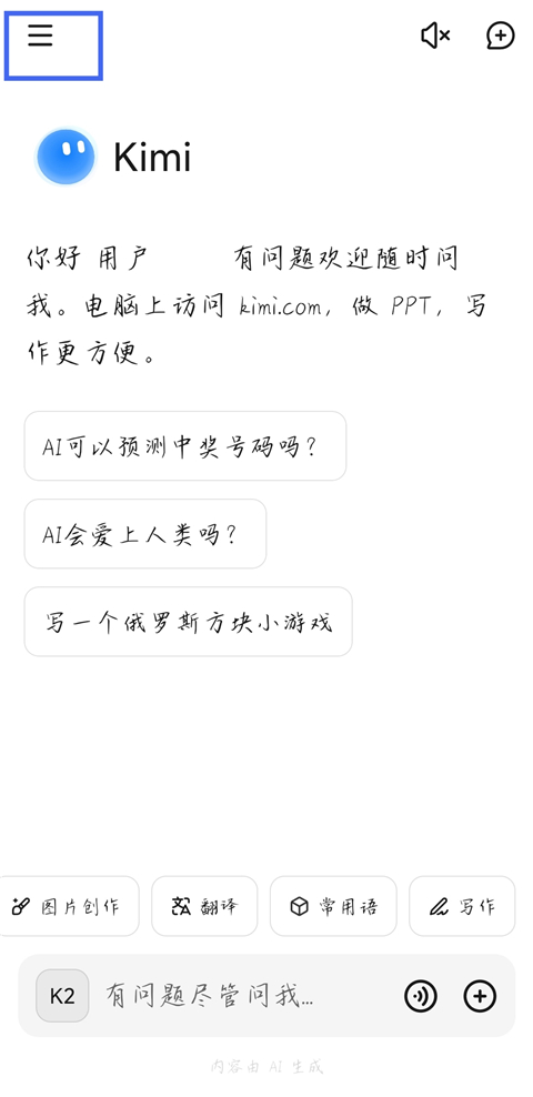 1、打开kimi智能助手,点击左上角三横线标识。