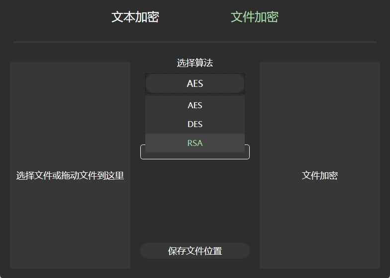 3、直接将文件拖拽到软件界面中,提供多种算法加密方式,如 “AES、RSA 等。选择适合的加密方式,并根据需要设置密码;